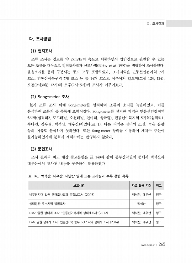 Ⅱ. 조사결과 www.nie.re.kr ? 265 다. 조사방법 1 현지조사 조류 조사는 경로를 약 2km/hr의 속도로 이동하면서 쌍안경으로 관찰할 수 있는 모든 조류를 대상으로 정점조사법과 선조사법 Bibby et al. 1997 을 병행하여 조사하였다. 울음소리를 통해 구분되는 종도 모두 포함하였다. 조사지역은 민통선인접지역 7개 코스, 민통선이북구역 7개 코스 등 총 14개 코스로 이루어져 있으며 그림 123, 124 , 오전 9시30분12시 과 오후 2시5시 에 조사가 이루어졌다. 2 Song-meter 조사 현지 조류 조사 외에 Song-meter를 설치하여 조류의 소리를 녹음하였고, 이를 분석하여 조류의 종 목록에 포함시켰다. Song-meter를 설치한 지역은 민통선인접지역 5지역 심적리2, ...