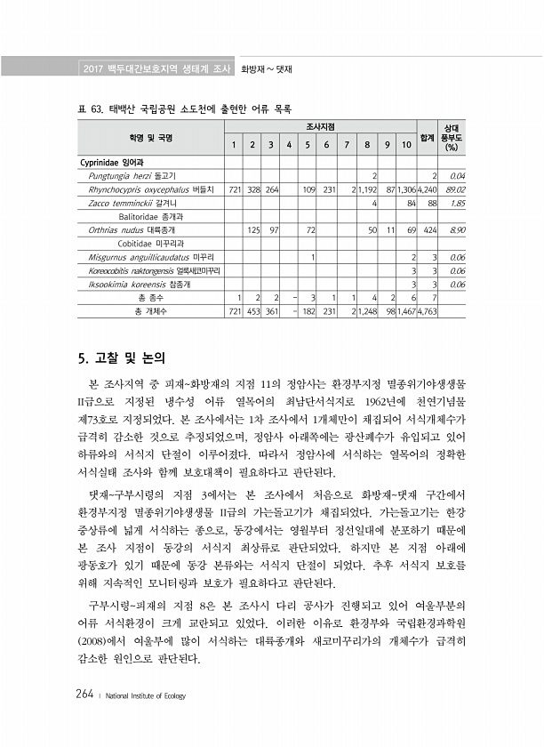 2017 백두대간보호지역 생태계 조사 화방재 댓재 264 ? National Institute of Ecology 표 63. 태백산 국립공원 소도천에 출현한 어류 목록 학명 및 국명 조사지점 합계 상대 풍부도 1 2 3 4 5 6 7 8 9 10 % Cyprinidae 잉어과 Pungtungia herzi 돌고기 2 2 0.04 Rhynchocypris oxycephalus 버들치 721 328 264 109 231 2 1,192 87 1,306 4,240 89.02 Zacco temminckii 갈겨니 4 84 88 1.85 Balitoridae 종개과 Orthrias nudus 대륙종개 125 97 72 50 11 69 424 8.90 Cobitidae 미꾸리과 Misgurnus anguillicauda...
