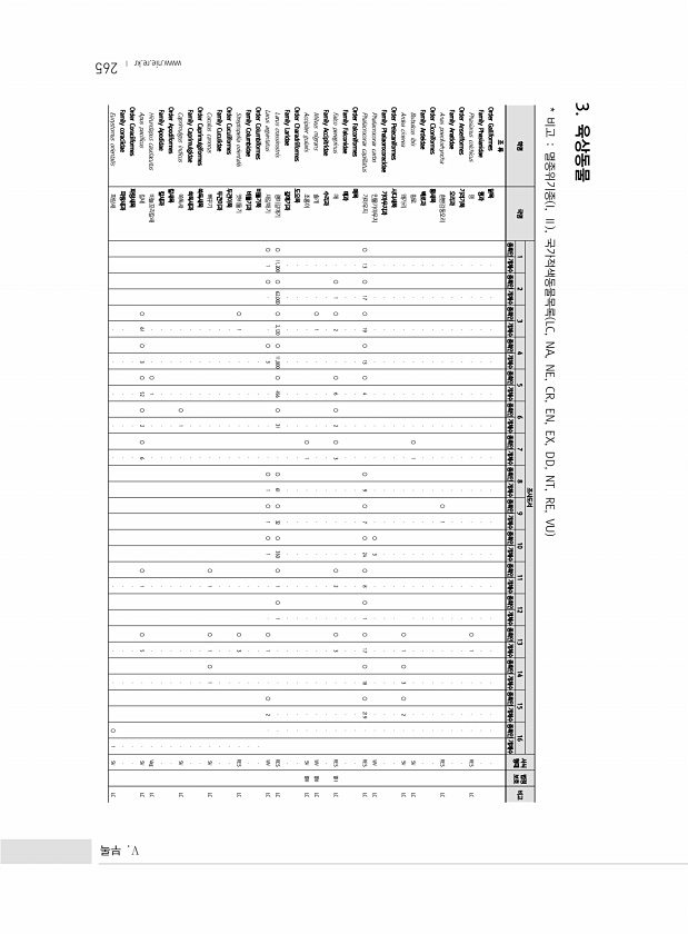 265 학명 국명 조사도서 서식 형태 법정 1 2 3 4 5 6 7 8 9 10 11 12 13 14 15 16 보호 비고 종확인 개체수 종확인 개체수 종확인 개체수 종확인 개체수 종확인 개체수 종확인 개체수 종확인 개체수 종확인 개체수 종확인 개체수 종확인 개체수 종확인 개체수 종확인 개체수 종확인 개체수 종확인 개체수 종확인 개체수 종확인 개체수 조 류 Order Galliformes 닭목 Family Phasianidae 꿩과 Phasianus colchicus 꿩 ○ 1 RES LC Order Anseriformes 기러기목 Family Anatidae 오리과 Anas poecilorhyncha 흰뺨검둥오리 ○ 1 ...