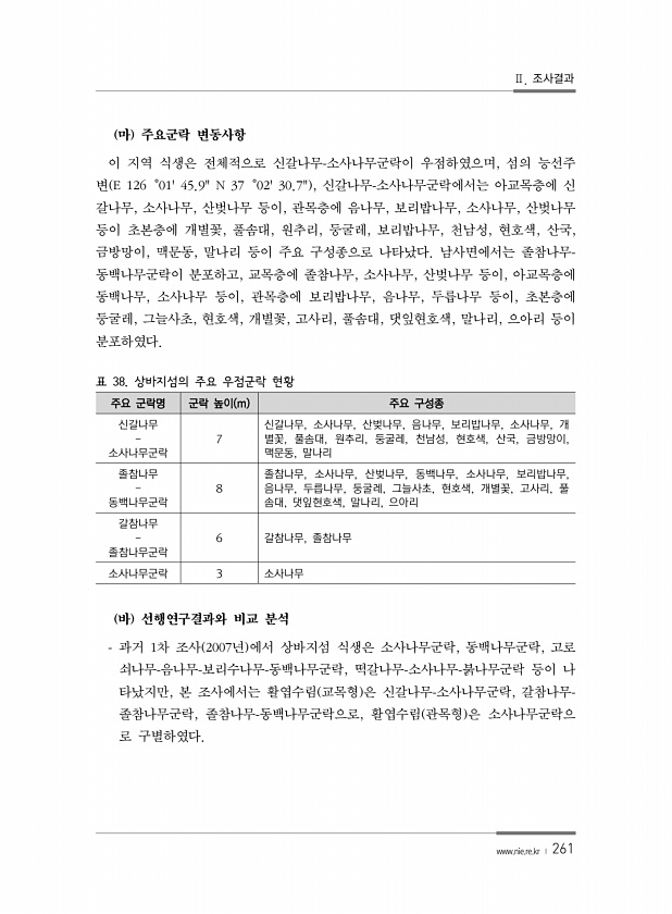 Ⅱ. 조사결과 www.nie.re.kr ? 261 마 주요군락 변동사항 이 지역 식생은 전체적으로 신갈나무-소사나무군락이 우점하였으며, 섬의 능선주 변 E 126。0145.9N 37。0230.7, 신갈나무-소사나무군락에서는 아교목층에 신 갈나무, 소사나무, 산벚나무 등이, 관목층에 음나무, 보리밥나무, 소사나무, 산벚나무 등이 초본층에 개별꽃, 풀솜대, 원추리, 둥굴레, 보리밥나무, 천남성, 현호색, 산국, 금방망이, 맥문동, 말나리 등이 주요 구성종으로 나타났다. 남사면에서는 졸참나무- 동백나무군락이 분포하고, 교목층에 졸참나무, 소사나무, 산벚나무 등이, 아교목층에 동백나무, 소사나무 등이, 관목층에 보리밥나무, 음나무, 두릅나무 등이, 초본층에 둥굴레, 그늘사초, 현호색, 개별꽃, 고사리, 풀솜대, 댓...
