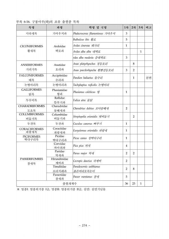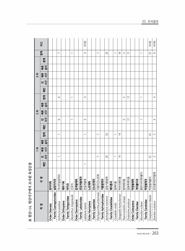 263 학 명 국 명 1 차 2 차 3 차 합계 비고 해빈 전 사구 배후 사구 배후 습지 합계 해빈 사구 전 배후 사구 배후 습지 합계 해빈 사구 전 배후 사구 배후 습지 합계 Order Odonata 잠자리목 Family Coenagrionidae 실잠자리과 Ischnura asiatica 아시아실잠자리 1 1 6 6 7 Order Orthoptera 메뚜기목 Family Tettigonidae 여치과 Oecanthus longicauda 긴꼬리 1 1 1 Order Dermaptera 집게벌레목 Family Labiduridae 큰집게벌레과 Labidura riparia 큰집게벌레 1 1 3 3 4 사구성 Order Hemiptera 노린재목 Family Lygaeidae 긴노린재과 Pachygronth...