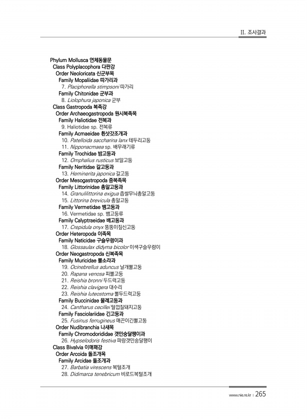 II. 조사결과 www.nie.re.kr ?265 Phylum Mollusca 연체동물문 Class Polyplacophora 다판강 Order Neoloricata 신군부목 Family Mopaliidae 따가리과 7. Placiphorella stimpsoni 따가리 Family Chitonidae 군부과 8. Liolophura japonica 군부 Class Gastropoda 복족강 Order Archaeogastropoda 원시복족목 Family Haliotidae 전복과 9. Haliotidae sp. 전복류 Family Acmaeidae 흰삿갓조개과 10. Patelloida saccharina lanx 테두리고둥 11. Nipponacmaea sp. 배무래기류 Family Trochidae ...