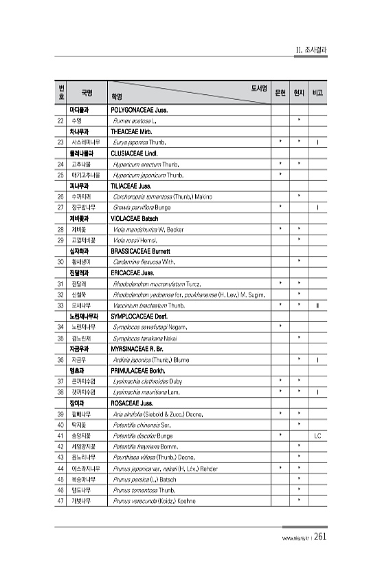 II. 조사결과 www.nie.re.kr ?261 번 호 국명 도서명 학명 문헌 현지 비고 마디풀과 POLYGONACEAE Juss. 22 수영 Rumex acetosa L. * 차나무과 THEACEAE Mirb. 23 사스레피나무 Eurya japonica Thunb. * * Ⅰ 물레나물과 CLUSIACEAE Lindl. 24 고추나물 Hypericum erectum Thunb. * * 25 애기고추나물 Hypericum japonicum Thunb. * 피나무과 TILIACEAE Juss. 26 수까치깨 Corchoropsis tomentosa Thunb. Makino * 27 장구밥나무 Grewia parviflora Bunge * Ⅰ 제비꽃과 VIOLACEAE Batsch 28 제비꽃 Viola ma...