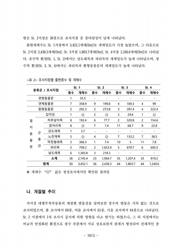 1013 받은 St. 2지점은 36종으로 조사지점 중 종다양성이 낮게 나타났다. 출현개체수는 St. 1지점에서 3,452.1개체/3m2로 개체밀도가 가장 높았으며, 그 다음으로 St. 2지점 2,438.3개체/3m2, St. 3지점 1,803.7개체/3m2, St. 4지점 1,240.6개체/3m2로 나타났 다. 유수역 환경 St. 1, St. 2 에서는 날도래목과 파리목의 개체밀도가 높게 나타났으며, 정 수역 환경 St. 3, St. 4 에서는 파리목과 환형동물문의 개체밀도가 높게 나타났다. 분류군 조사지점 St. 1 St. 2 St. 3 St. 4 종수 개체수 종수 개체수 종수 개체수 종수 개체수 편형동물문 1 55.5 연체동물문 7 358.9 9 199.8 4 169.3 4 99 환형동물문 5 292.3...