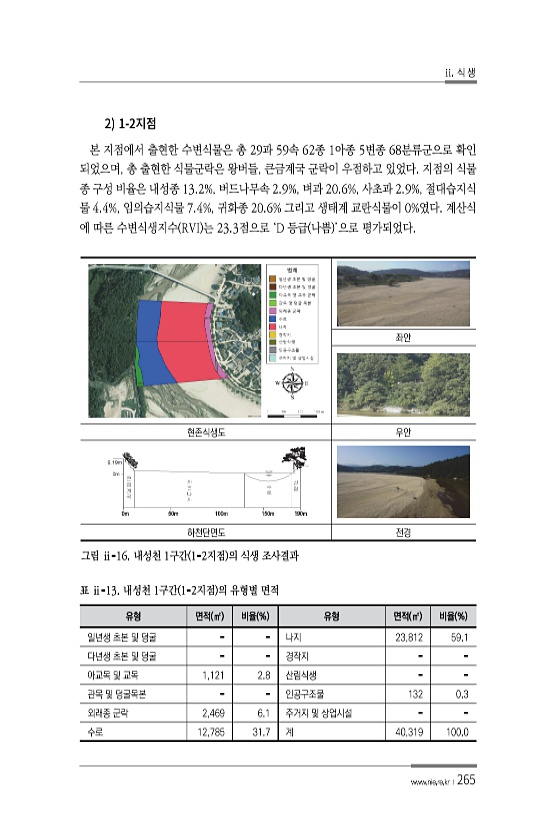 ii. 식 생 www.nie.re.kr ?265 2 1- 본 지점에서 출현한 수변식물은 총 29과 59속 62종 1아종 5변종 68분류군으로 확인 되었으며, 총 출현한 식물군락은 왕버들, 큰금계국 군락이 우점하고 있었다. 지점의 식물 종 구성 비율은 내성종 13.2%, 버드나무속 2.9%, 벼과 20.6%, 사초과 2.9%, 절대습지식 물 4.4%, 임의습지식물 7.4%, 귀화종 20.6% 그리고 생태계 교란식물이 0%였다. 계산식 에 따른 수변식생지수 RVI 는 23.3점으로 ‘D 등급 나쁨 ’으로 평가되었다. 좌안 현존식생도 우안 하천단면도 전경 그림 ⅱ-16. 내성천 1구간 1-2지점 의 식생 조사결과 유형 면적 ㎡ 비율 % 유형 면적 ㎡ 비율 % 일년생 초본 및 덩굴 나지 23,812 59.1 다년생...