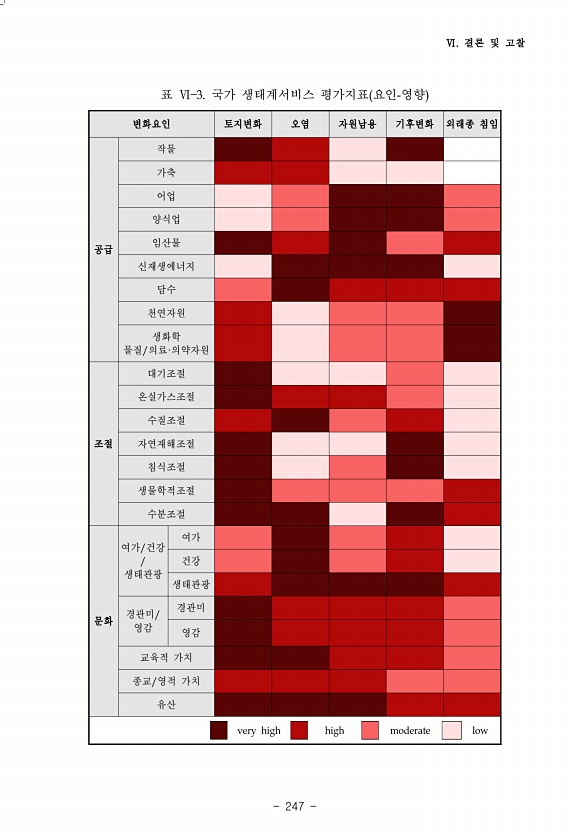 Ⅵ. 결론 및 고찰 247 변화요인 토지변화 오염 자원남용 기후변화 외래종 침임 공급 작물 가축 어업 양식업 임산물 신재생에너지 담수 천연자원 생화학 물질/의료·의약자원 조절 대기조절 온실가스조절 수질조절 자연재해조절 침식조절 생물학적조절 수분조절 문화 여가/건강 생태관광 여가 건강 생태관광 경관미/ 영감 경관미 영감 교육적 가치 종교/영적 가치 유산 very high high moderate low 표 Ⅵ 3. 국가 생태계서비스 평가지표 요인-영향