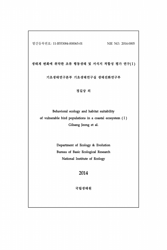 발간등록번호11-B553084-000065-01 NIE NO. 2014-0005 생태계 변화에 취약한 조류 행동생태 및 서식지 적합성 평가 연구 Ⅰ 기초생태연구본부 기초생태연구실 생태진화연구부 정길상 외 Behavioral ecology and habitat suitability of vulnerable bird populations in a coastal ecosystem Ⅰ Gilsang Jeong et al. Department of Ecology & Evolution Bureau of Basic Ecological Research National Institute of Ecology 2014국립생태원