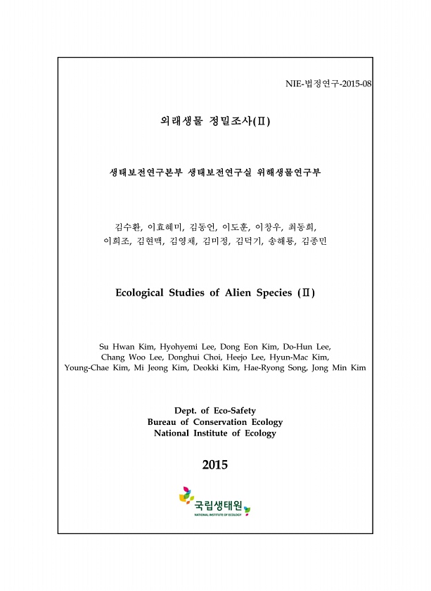 NIE-법정연구-2015-08 외래생물 정밀조사 Ⅱ 생태보전연구본부 생태보전연구실 위해생물연구부 김수환, 이효혜미, 김동언, 이도훈, 이창우, 최동희, 이희조, 김현맥, 김영채, 김미정, 김덕기, 송해룡, 김종민 Ecological Studies of Alien Species Ⅱ Su Hwan Kim, Hyohyemi Lee, Dong Eon Kim, Do-Hun Lee, Chang Woo Lee, Donghui Choi, Heejo Lee, Hyun-Mac Kim, Young-Chae Kim, Mi Jeong Kim, Deokki Kim, Hae-Ryong Song, Jong Min Kim Dept. of Eco-Safety Bureau of Conservation Ecology National Insti...