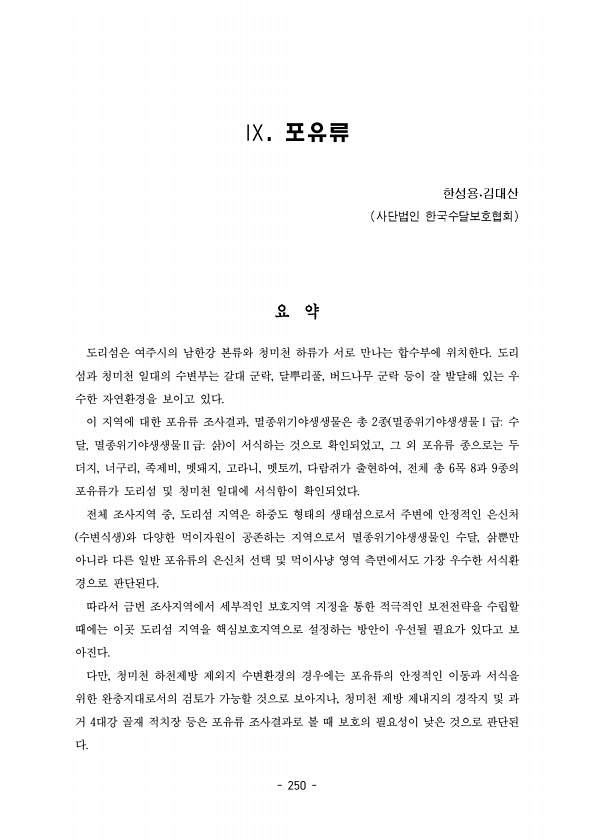 250 포유류.Ⅸ · 도리섬은 여주시의 남한강 본류와 청미천 하류가 서로 만나는 합수부에 위치한다 도리. 섬과 청미천 일대의 수변부는 갈대 군락 달뿌리풀 버드나무 군락 등이 잘 발달해 있는 우 , , 수한 자연환경을 보이고 있다. 이 지역에 대한 포유류 조사결과 멸종위기야생생물은 총 종 멸종위기야생생물 급 수 , 2 Ⅰ 달 멸종위기야생생물 급 삵 이 서식하는 것으로 확인되었고 그 외 포유류 종으로는 두 , Ⅱ , 더지, , , , , , 너구리 족제비 멧돼지 고라니 멧토끼 다람쥐가 출현하여 전체 총 목 과 종의 , 6 8 9 포유류가 도리섬 및 청미천 일대에 서식함이 확인되었다. 전체 조사지역 중 도리섬 지역은 하중도 형태의 생태섬으로서 주변에 안정적인 은신처 , 수변식생 와 다양한 먹이자원이 공존하는 지역...