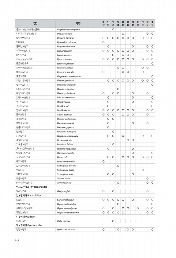 274 홍보라노린재 보라노린재 Carpocoris purpureipennis ○ 다리무늬두흰점노린재 Dalpada cinctipes ○ ○ ○ 알락수염노린재 Dolycoris baccarum ○ ○ ○ ○ ○ ○ ○ ○ ○ ○ 빈대붙이 Dybowskyia reticulata ○ 홍비단노린재 Eurydema dominulus ○ ○ ○ ○ 북쪽비단노린재 Eurydema gebleri ○ ○ ○ ○ ○ ○ ○ ○ ○ 비단노린재 Eurydema rugosa ○ ○ ○ ○ 가시점둥글노린재 Eysarcoris aeneus ○ ○ ○ ○ ○ ○ ○ ○ ○ ○ 둥글노린재속 Eysarcoris gibbosus ○ 점박이둥글노린재 Eysarcoris guttiger ○ ○ ○ ○ 배둥글노린재 Eysarcoris ventra...