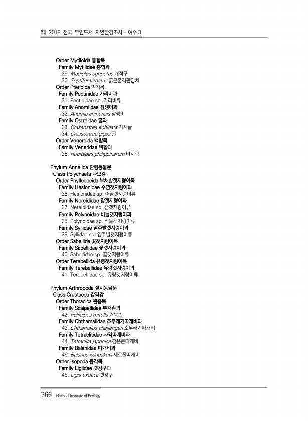 2018 전국 무인도서 자연환경조사 여수 3 266 ? National Institute of Ecology Order Mytiloida 홍합목 Family Mytilidae 홍합과 29. Modiolus agripetus 개적구 30. Septifer virgatus 굵은줄격판담치 Order Pterioida 익각목 Family Pectinidae 가리비과 31. Pectinidae sp. 가리비류 Family Anomiidae 잠쟁이과 32. Anomia chinensis 잠쟁이 Family Ostreidae 굴과 33. Crassostrea echinata 가시굴 34. Crassostrea gigas 굴 Order Veneroida 백합목 Family Veneridae 백합과 35. Ruditapes...