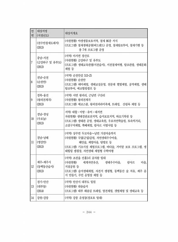 244 연 번 대상지명 지정년도 대상지개요 천수만철새도래지 2013 자원현황 야생생물보호지역, 철새 86종 서식 프로그램 철새생태공원 버드랜드 운영, 철새탐조투어, 철새기행 등 총 7개 프로그램 운영 7 충남-서천 금강하구 및 유부도 2013 지역 마서면 장산로 자원현황 금강하구 및 유부도 프로그램 생태교육관광 서천습지 , 서천철새여행, 탐조관광, 생태문화 체험 등 8 전남-순천 순천만 2013 지역 순천만길 513-25 자원현황 순천만 프로그램 테마체험, 생태교실운영, 천문대 별빛체험, 공작체험, 생태 탐조투어, 에코힐링캠프 등 9 경북-울진 왕피천계곡 2013 지역 서면 왕피리, 근남면 구산리 자원현황 왕피천계곡 프로그램 에코스쿨, 왕피천피라미축제, 트래킹, 산림욕 체험 등 10 경남-창녕 우포늪 201...