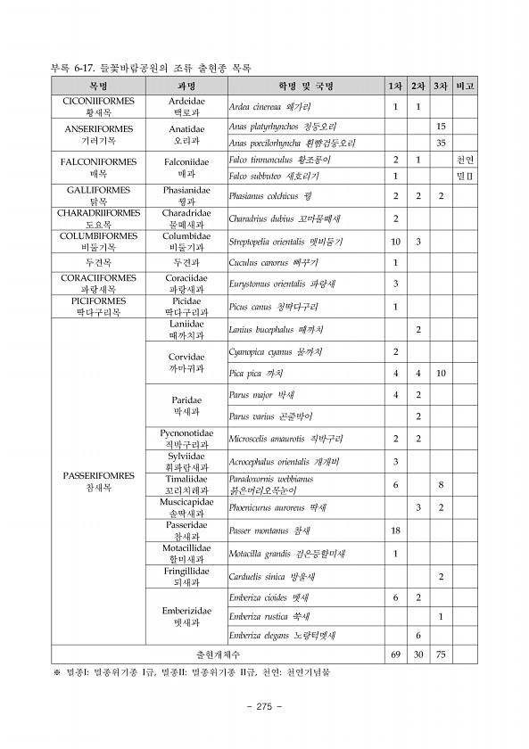 2018 전국 무인도서 자연환경조사 여수 1 266 ? National Institute of Ecology 4. 조류는 7 목 21 과 31 종 274 개체 등 총 31 분류군이 조사되었다. 환경부 지정 멸종위 기야생식물 Ⅰ급 조류는 매 1 종이, Ⅱ급 조류는 새매, 흑비둘기, 섬개개비 3 종이 확인되 었고 보호종은 흑로, 칼새, 흰눈썹황금새 3 종이 확인되었다. 포유류는 수달, 염소, 집쥐 시궁쥐 3 종이 확인되었으며, 환경부 지정 멸종위기야생동식물 Ⅰ급은 수달 1 종이었 다. 양서파충류는 먹구렁이, 도마뱀 2 종이 확인되었고 환경부 지정 멸종위기야생동식물 Ⅱ급은 먹구렁이 1 종이었다. 역만도에서 다수의 흑비둘기가 서식하고 있는 것으로 확인되었으며 칼퀴섬은 매가 확 인되었다. 수달은 조사한 섬 전역 진대...