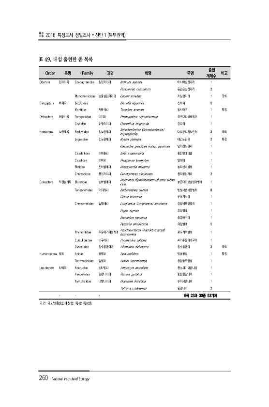 2018 특정도서 정밀조사 신안 1 북부권역 260 ? National Institute of Ecology Order 목명 Family 과명 학명 국명 출현 개체수 비고 Odonata 잠자리목 Coenagrionidae 실잠자리과 Ischnura asiatica 아시아실잠자리 1 Paracercion calamorum 등검은실잠자리 2 Platycnemididae 방울실잠자리과 Copera annulata 자실잠자리 1 국외 Dictyoptera 바퀴목 Ectobiidae Blattella nipponica 산바퀴 5 Mantidae 사마귀과 Tenodera sinensis 왕사마귀 1 특정 Orthoptera 메뚜기목 Tettigoniidae 여치과 Phaneroptera nigroantennat...
