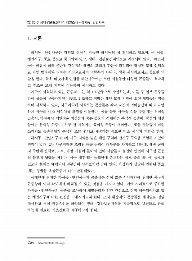 2016 생태·경관보전지역 정밀조사 하시동 · 안인사구 264 ? National Institute of Ecology 1. 서론 하시동·안인사구는 강원도 강릉시 강동면 하시동3리에 위치하고 있으며, 군 시설, 해안사구, 풍호 등으로 둘러싸여 있고, 생태·경관보전지역으로 지정되어 있다. 해안사 구는 바람에 의해 운반된 간석지와 해빈의 모래가 후안에 퇴적되어 형성된 모래 언덕으 로 자연 방파제와 지하수 저장고로서의 역할뿐만 아니라, 생물 서식지로서도 중요한 역 할을 한다. 특히 바닷가에 인접한 해안사구에는 오랜 세월동안 다양한 곤충들이 척박하 고 건조한 모래 지형에 적응하며 서식하고 있다. 지구에 서식하고 있는 곤충의 수는 약 100만종으로 추산하는데, 이들 중 일부 곤충들 만이 생물이 살아가기엔 너무도 건조...