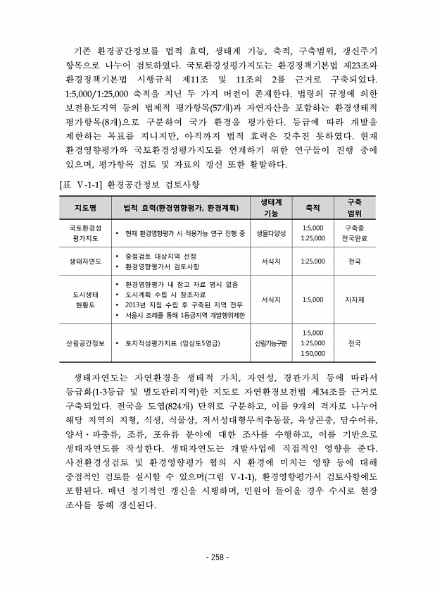기존 환경공간정보를 법적 효력, 생태계 기능, 축적, 구축범위, 갱신주기 항목으로 나누어 검토하였다. 국토환경성평가지도는 환경정책기본법 제23조와 환경정책기본법 시행규칙 제11조 및 11조의 2를 근거로 구축되었다. 15,000/125,000 축적을 지닌 두 가지 버전이 존재한다. 법령의 규정에 의한 보전용도지역 등의 법제적 평가항목 57개 과 자연자산을 포함하는 환경생태적 평가항목 8개 으로 구분하여 국가 환경을 평가한다. 등급에 따라 개발을 제한하는 목표를 지니지만, 아직까지 법적 효력은 갖추진 못하였다. 현재 환경영향평가와 국토환경성평가지도를 연계하기 위한 연구들이 진행 중에 있으며, 평가항목 검토 및 자료의 갱신 또한 활발하다. 지도명 법적 효력 환경영향평가, 환경계획 생태계 기능 축적 구축 범위 국...