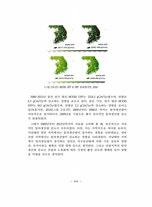 606 그림 2-6-25 MODIS GPP & NPP 분포 홍지연, 2014 2000-2012년 동안 전국 평균 MODIS GPP는 1554.5 gC/m2/yr였으며, 연평균 6.2 gC/m2/yr씩 감소하는 경향을 보이고 있다. 같은 기간, 전국 평균 MODIS NPP는 841 gC/m2/yr였으며, 연평균 3.2 gC/m2/yr씩 감소하는 경향을 보이고 있다 홍지연, 2014 그림 2-6-27 2000년부터 2008년 까지는 일차생산량이 지속적으로 증가하다가, 2009년을 기점으로 해서 전국적인 일차생산량 감소 가 관찰되었다. 그래서 2000년부터 2012년까지의 자료를 고려해 볼 때, 전국적으로 지속 적인 일차생산량 감소가 이루어졌다. 다만, 이는 지역적으로 차이를 보여서, 서남해안 연안 지역에서는 일...