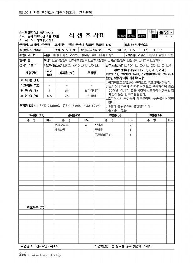 2016 전국 무인도서 자연환경조사 군산권역 266 ? National Institute of Ecology 조사표번호 십이동파도6-2 조사 일자 2016년 4월 19일 조 사 자 방제용,이지효 식 생 조 사표 군락명보리장나무군락 조사지역전북 군산시 옥도면 연도리 170 도엽명 격자번호 식생상관관목림 면적5 × 5 ㎡ 위·경도 GPS 35 ° 59 ′ 50 ″N, 126 ° 13 ′ 11 ″E 해발20 m 지형□산정 □능선 ?사면 ?상?중□하 □계곡 □평지 미세지형?평면 □돌출 □함몰 □요철 방위동 토양□갈색삼림토 □적황색삼림토 □암적색삼림토 □회갈색삼림토 □침식토 □미숙토 □암쇄토 경사10 ° 낙엽부식층 cm □≥20 ? 15 □ 10 □ 5 □0 암석노출 % □≥51 □〈50 □〈25 □〈5 □0 계층구...