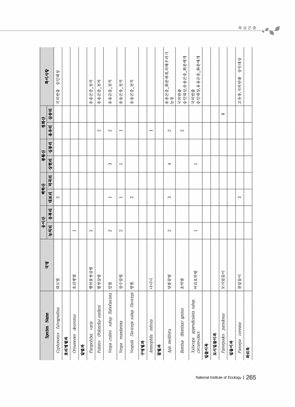 육 상 곤 충 National Institute of EcologyⅠ265 Species Name 국명 웅이산 백학산 봉황산 청화산 특이사항 능치리 웅북리 대포리 덕곡리 상현리 심봉리 용유리 삼송리 Cyphononyx fulvognathus 대모벌 2 국외반출 승인대상 호리병벌과 Oreumenes decoratus 호리병벌 1 말벌과 Parapolybia varia 뱀허물쌍살벌 2 유용곤충_천적 Polistes Polistella snelleni 별쌍살벌 2 유용곤충_천적 Vespa crabro subsp. flabofasciata 말벌 2 1 3 2 유용곤충_천적 Vespa mandarinia 장수말벌 2 1 1 1 유용곤충_천적 Vespula flaviceps subsp. flaviceps 땅벌 2 유용...