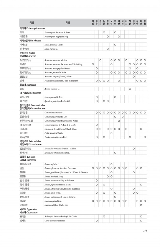 273 가래과 Potamogetonaceae 가래 Potamogeton distinctus A. Benn. ○ ○ 버들말즘 Potamogeton oxyphyllus Miq. ○ ○ 나자스말과 Najadaceae 나자스말 Najas graminea Delile ○ 민나자스말 Najas marina L. ○ 천남성목 Arales 천남성과 Araceae 둥근잎천남성 Arisaema amurense Maxim. ○ ○ ○ ○ ○ ○ ○ ○ 천남성 Arisaema amurense for. serratum Nakai Kitag. ○ ○ ○ ○ ○ ○ ○ 두루미천남성 Arisaema heterophyllum Blume ○ ○ ○ 점백이천남성 Arisaema peninsulae Nakai ○ ○ ○ ○ ○ ○ ○ ○ ○ ...