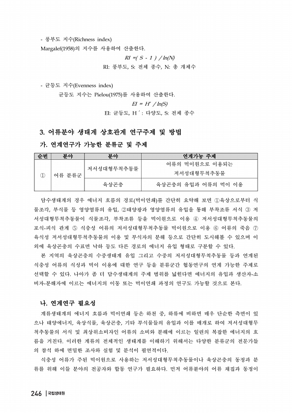 풍부도 지수 의 지수를 사용하여 산출한다 풍부도 전체 종수 총 개체수 균등도 지수 균등도 지수는 를 사용하여 산출한다 균등도 다양도 전체 종수 어류분야 생태계 상호관계 연구주제 및 방법 가 연계연구가 가능한 분류군 및 주제 순번 분야 분야 연계가능 주제 어류 분류군 저서성대형무척추동물 어류의 먹이원으로 이용되는 저서성대형무척추동물 육상곤충 육상곤충의 유입과 어류의 먹이 이용 담수생태계의 경우 에너지 흐름의 경로 먹이연쇄 를 간단히 요약해 보면 육상으로부터 식 물조각 부식물 등 영양염류의 유입 태양광과 영양염류의 유입을 통해 부착조류 서식 저 서성대형무척추동물이 식물조각 부착조류 등을 먹이원으로 이용 저서성대형무척추동물의 포식 피식 관계 식충성 어류의 저서성대형무척추동물 먹이원으로 이용 어류의 죽음 육식성 저...