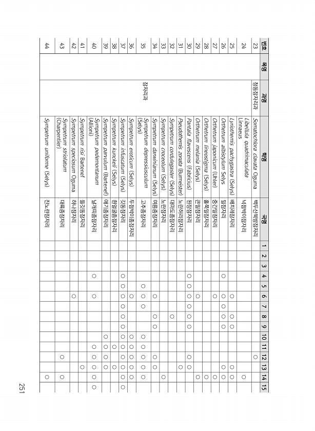 251 번호 목명 과명 학명 국명 1 2 3 4 5 6 7 8 9 10 11 12 13 14 15 23 청동잠자리과 Somatochlora clavata Oguma 백두산북방잠자리 ○ 24 잠자리과 Libellula quadrimaculata Linnaeus 넉점박이잠자리 ○ 25 Lyriothemis pachygastra Selys 배치레잠자리 ○ ○ ○ ○ ○ 26 Orthetrum albistylum Selys 밀잠자리 ○ ○ ○ ○ ○ ○ ○ 27 Orthetrum japonicum Uhler 중간밀잠자리 ○ ○ 28 Orthetrum lineostigma Selys 홀쭉밀잠자리 ○ 29 Orthetrum melania Selys 큰밀잠자리 ○ ○ 30 Pantala flavescens Fabrici...