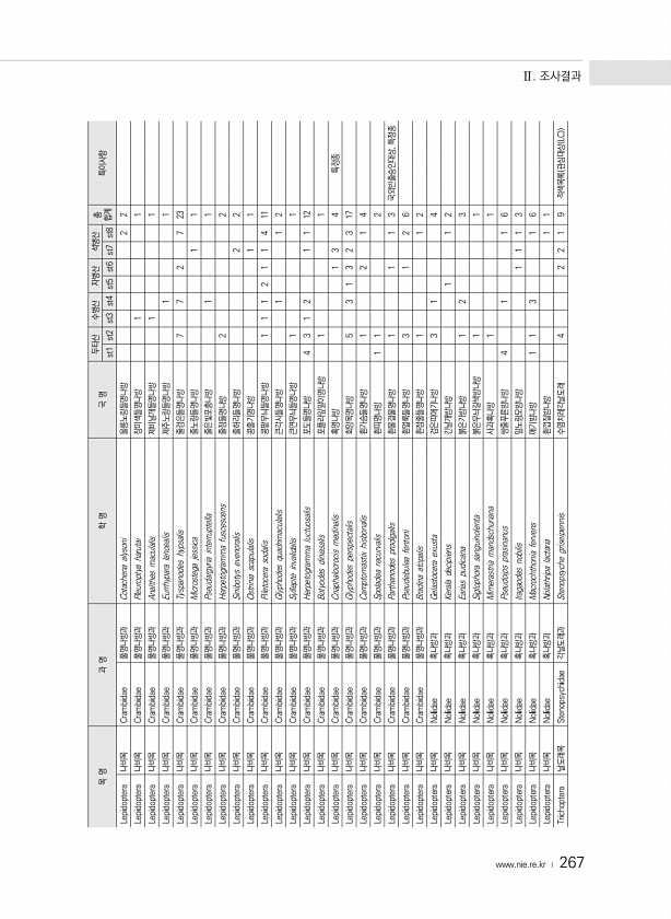 www ·nie·re·kr ? 267 목 명 과 명 학 명 국 명 두타산 수병산 자병산 석병산 총 st1 st2 st3 st4 st5 st6 st7 st8 합계 특이사항 Lepidoptera 나비목 Crambidae 풀명나방과 Cotachena alysoni 울릉노랑들명나방 2 2 Lepidoptera 나비목 Crambidae 풀명나방과 Pleuroptya harutai 장미색들명나방 1 1 Lepidoptera 나비목 Crambidae 풀명나방과 Analthes maculalis 제비날개들명나방 1 1 Lepidoptera 나비목 Crambidae 풀명나방과 Eurrhypara lancealis 제주노랑들명나방 1 1 Lepidoptera 나비목 Crambidae 풀명나방과 Tyspanodes hypsal...