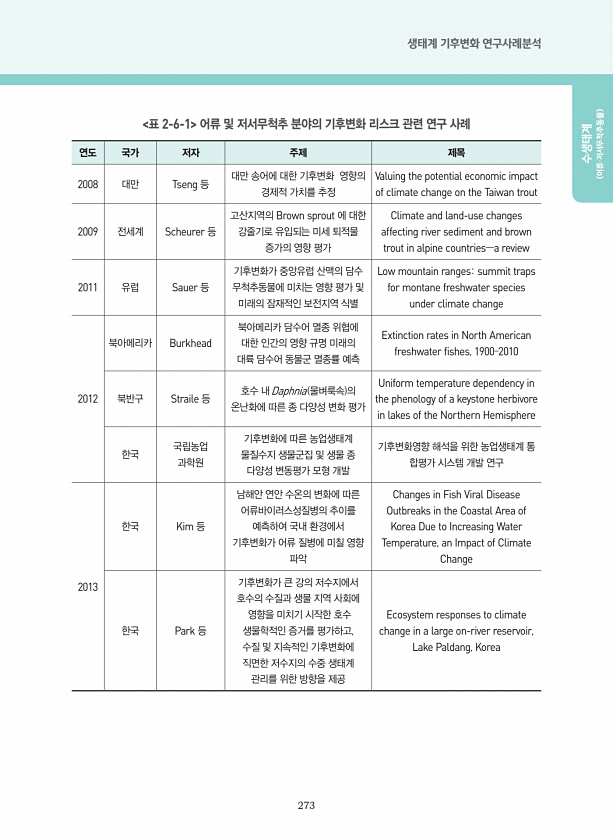273 생태계 기후변화 연구사례분석 수생태계 어류·저서무척추동물 표 2-6-1 어류 및 저서무척추 분야의 기후변화 리스크 관련 연구 사례 연도 국가 저자 주제 제목 2008 대만 Tseng 등 대만 송어에 대한 기후변화 영향의 경제적 가치를 추정 Valuing the potential economic impact of climate change on the Taiwan trout 2009 전세계 Scheurer 등 고산지역의 Brown sprout 에 대한 강줄기로 유입되는 미세 퇴적물 증가의 영향 평가 Climate and land-use changes affecting river sediment and brown trout in alpine countries?a review 2011 유럽 Sauer 등 ...