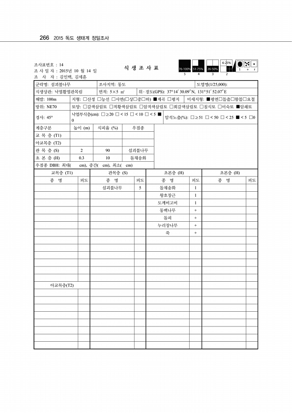 266 2015 독도 생태계 정밀조사 조사표번호 14 조 사 일 자 2015년 10 월 14 일 조 사 자 김인택, 김세훈 식 생 조 사 표 군락명섬괴불나무 조사지역동도 도엽명 1/25,000 식생상관낙엽활엽관목림 면적5×5 ㎡ 위 ? 경도 GPS 37°14′ 30.09″N, 131°51′ 52.07″E 해발100m 지형□산정 □능선 □사면 □상□중□하 ■계곡 □평지 미세지형■평면□돌출□함몰□요철 방위NE70 토양□갈색삼림토 □적황색삼림토 □암적색삼림토 □회갈색삼림토 □침식토 □미숙토 ■암쇄토 경사45° 낙엽부식층 cm □≥20 □ 15 □ 10 □ 5 ■ 0 암석노출 % □≥51 □ 50 □ 25 ■ 5 □0 계층구분 높이 m 식피율 % 우점종 교 목 층 T1 아교목층 T2 관 목 층 S 2 90 섬괴불나...