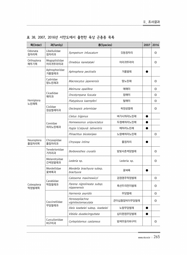 Ⅱ. 조사결과 www.nie.re.kr ? 265 목 Order 과 Family 종 Species 2007 2016 Odonata 잠자리목 Libellulidae 잠자리과 Sympetrum infuscatum 깃동잠자리 ◎ Orthoptera 메뚜기목 Mogoplistidae 어리귀뚜라미과 Ornebius kanetataki 어리귀뚜라미 ◎ Hemiptera 노린재목 Aphrophoridae 거품벌레과 Aphrophora pectiralis 거품벌레 ● Cydnidae 땅노린재과 Macroscytus japonensis 땅노린재 ◎ Cicadidae 매미과 Meimuna opalifera 애매미 ◎ Oncotympana fuscata 참매미 ◎ Platypleura kaempferi 털매미 ◎ Cixiida...