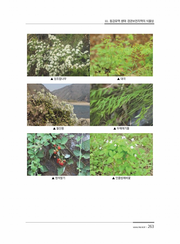 iii. 동강유역 생태·경관보전지역의 식물상 www.nie.re.kr ?263 ▲ 당조팝나무 ▲ 대극 ▲ 돌단풍 ▲ 두메애기풀 ▲ 멍석딸기 ▲민졸방제비꽃