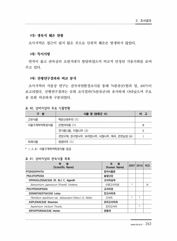 Ⅱ. 조사결과 www.nie.re.kr ? 263 학 명 Scientific Name 국 명 Korean Name 2007 2016 비고 PTERIDOPHYTA 양치식물문 PSILOTOPSIDA 솔일난강 OPHIOGLOSSACEAE R. Br. C. Agardh 고사리삼과 Botrychium japonicum Prantl Underw. 산꽃고사리삼 * Ⅳ POLYPODIOPSIDA 고사리강 DENNSTAEDTIACEAE Lotsy 잔고사리과 Pteridium aquilinum var. latiusculum Desv. A. Heller 고사리 * * ASPLENIACEAE Newman 꼬리고사리과 Asplenium incisum Thunb. 꼬리고사리 * DRYOPTERIDACEAE Herter 관중과 다 생...