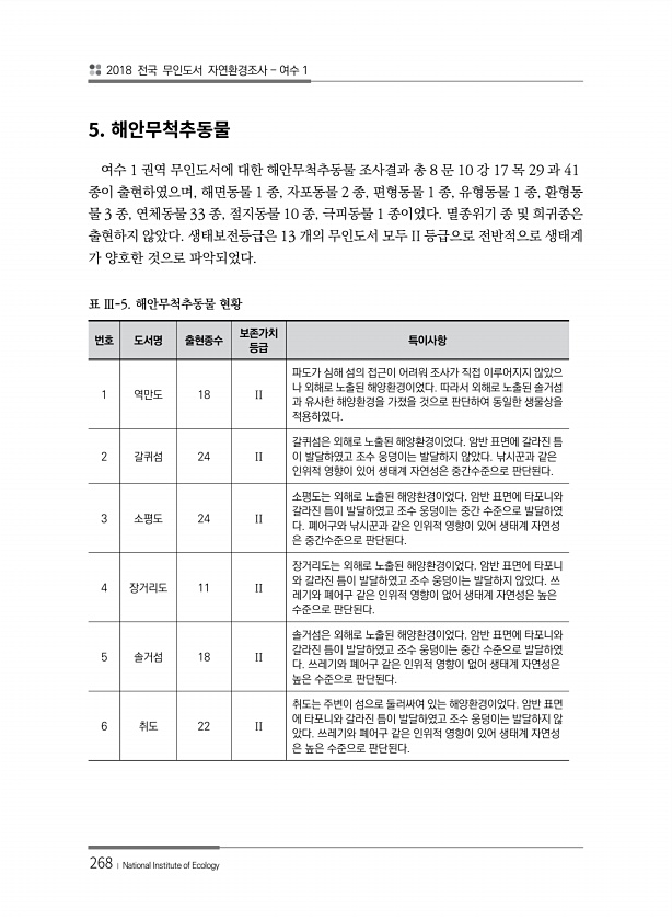 2018 전국 무인도서 자연환경조사 여수 1 268 ? National Institute of Ecology 5. 여수 1 권역 무인도서에 대한 해안무척추동물 조사결과 총 8 문 10 강 17 목 29 과 41 종이 출현하였으며, 해면동물 1 종, 자포동물 2 종, 편형동물 1 종, 유형동물 1 종, 환형동 물 3 종, 연체동물 33 종, 절지동물 10 종, 극피동물 1 종이었다. 멸종위기 종 및 희귀종은 출현하지 않았다. 생태보전등급은 13 개의 무인도서 모두 II 등급으로 전반적으로 생태계 가 양호한 것으로 파악되었다. 번호 도서명 출현종수 보존가치 등급 특이사항 1 역만도 18 II 파도가 심해 섬의 접근이 어려워 조사가 직접 이루어지지 않았으 나 외해로 노출된 해양환경이었다. 따라서 외해로 노출된 솔...