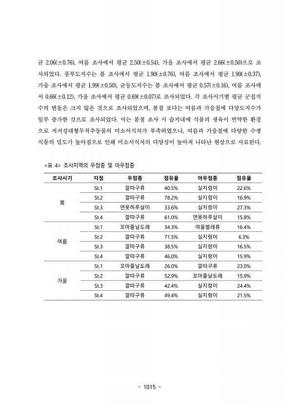 1016 조사시기 지점 우점도지수 다양도지수 풍부도지수 균등도지수 봄 St.1 0.63 2.59 2.02 0.68 St.2 0.95 1.05 1.04 0.35 St.3 0.61 2.40 1.69 0.69 St.4 0.77 2.20 2.86 0.55 평균 0.74 ±0.16 2.06 ±0.69 1.90 ±0.76 0.57 ±0.16 여름 St.1 0.51 3.00 2.44 0.71 St.2 0.78 1.73 1.66 0.48 St.3 0.55 2.70 1.69 0.75 St.4 0.62 2.55 1.79 0.71 평균 0.61 ±0.12 2.50 ±0.54 1.90 ±0.37 0.66 ±0.12 가을 St.1 0.49 3.40 2.66 0.79 St.2 0.69 2.42 2.08 0.62 St.3 0.67 2...
