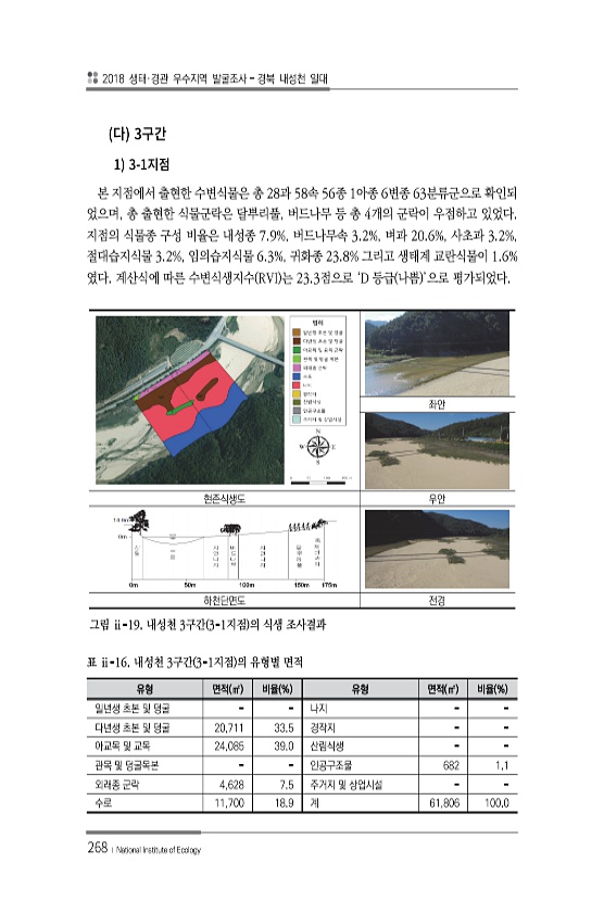 2018 생태·경관 우수지역 발굴조사 경북 내성천 일대 268 ? National Institute of Ecology 3 1 3- 본 지점에서 출현한 수변식물은 총 28과 58속 56종 1아종 6변종 63분류군으로 확인되 었으며, 총 출현한 식물군락은 달뿌리풀, 버드나무 등 총 4개의 군락이 우점하고 있었다. 지점의 식물종 구성 비율은 내성종 7.9%, 버드나무속 3.2%, 벼과 20.6%, 사초과 3.2%, 절대습지식물 3.2%, 임의습지식물 6.3%, 귀화종 23.8% 그리고 생태계 교란식물이 1.6% 였다. 계산식에 따른 수변식생지수 RVI 는 23.3점으로 ‘D 등급 나쁨 ’으로 평가되었다. 좌안 현존식생도 우안 하천단면도 전경 그림 ⅱ-19. 내성천 3구간 3-1지점 의 식생 조사결과 유형 면적 ...