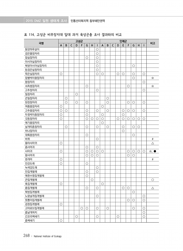 2015 DMZ 일원 생태계 조사 민통선이북지역 동부해안권역 268 ? National Institute of Ecology 국명 고성군 인제군 비고 A B C D F G H I A B C D E F G H I 동양하루살이 ○ 검은물잠자리 ○ 참실잠자리 ○ ○ 아시아실잠자리 ○ 북방아시아실잠자리 ○ ○ 등검은실잠자리 ○ 묵은실잠자리 ○ ○ ○ ○ ○ ○ ○ 참별박이왕잠자리 ○ ☆ 왕잠자리 ○ 쇠측범잠자리 ○ ○ ☆ 고추잠자리 ○ ○ 밀잠자리 ○ 큰밀잠자리 ○ ○ 된장잠자리 ○ ○ ○ ○ ○ ○ ○ 여름좀잠자리 ○ ○ 고추좀잠자리 ○ ○ ○ ○ ○ ○ ○ ○ ○ 두점박이좀잠자리 ○ ○ ○ ○ 깃동잠자리 ○ ○ ○ ○ ○ ○ ○ ○ ○ ○ ○ 애기좀잠자리 ○ 날개띠좀잠자리 ○ ○ ○ ○ ○ ○ ○ 하나잠자리 ○...