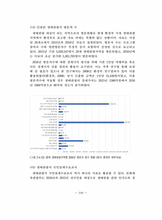 246 나 인증된 생태관광지 방문객 수 생태관광 대상이 되는 지역으로의 방문현황은 현재 환경부 지정 생태관광 지역에서 환경부로 보고한 자료 외에는 특별히 없는 상황이다. 자료는 지정 된 20개소에서 2015년과 2016년 자료가 집계되었다. 방문자 수는 프로그램 참여자 수와 일반방문자수 추정치 등이 포함되어 산정된 것으로 보고되고 있다. 2015년 기준 5,029,547명이 20개 생태관광지역을 방문하였고, 2016년에 는 이보다 조금 증가한 5,301,705명이 방문하였다. 2016년 방문자수에 대한 경제가치 평가를 위해 기존 1인당 여행비용 혹은 다른 경제가치 산출 결과의 활용이 요구된다. 이는 추후 연구를 통해 보정 해 갈 필요가 있으나 본 연구에서는 2008년 환경부 연구결과가 있어 이를 활용하였다 ...