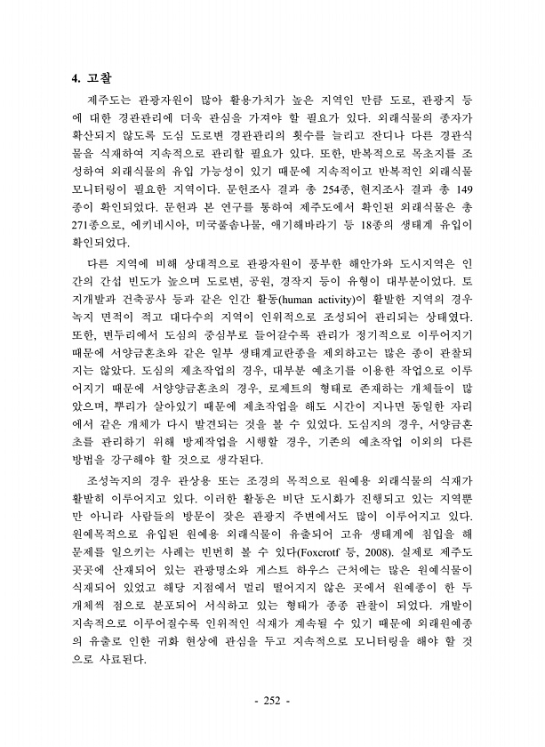 252 4. 고찰 제주도는 관광자원이 많아 활용가치가 높은 지역인 만큼 도로, 관광지 등 에 대한 경관관리에 더욱 관심을 가져야 할 필요가 있다. 외래식물의 종자가 확산되지 않도록 도심 도로변 경관관리의 횟수를 늘리고 잔디나 다른 경관식 물을 식재하여 지속적으로 관리할 필요가 있다. 또한, 반복적으로 목초지를 조 성하여 외래식물의 유입 가능성이 있기 때문에 지속적이고 반복적인 외래식물 모니터링이 필요한 지역이다. 문헌조사 결과 총 254종, 현지조사 결과 총 149 종이 확인되었다. 문헌과 본 연구를 통하여 제주도에서 확인된 외래식물은 총 271종으로, 에키네시아, 미국풀솜나물, 애기해바라기 등 18종의 생태계 유입이 확인되었다. 다른 지역에 비해 상대적으로 관광자원이 풍부한 해안가와 도시지역은 인 간의 간...