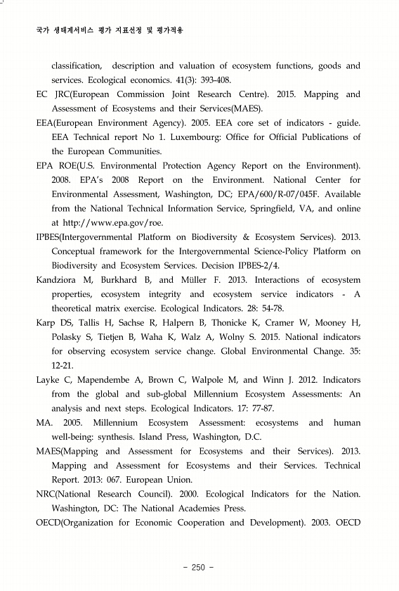 국가 생태계서비스 평가 지표선정 및 평가적용 250 classification, description and valuation of ecosystem functions, goods and services. Ecological economics. 41 3 393-408. EC JRC European Commission Joint Research Centre 2015. Mapping and Assessment of Ecosystems and their Services MAES EEA European Environment Agency 2005. EEA core set of indicators guide. EEA Technical report No 1. LuxembourgOffice for Official Publ...