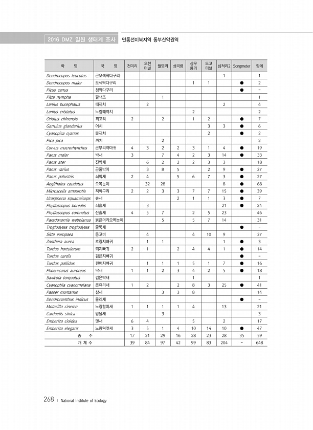 2016 DMZ 일원 생태계 조사 민통선이북지역 동부산악권역 268 ? National Institute of Ecology 학 명 국 명 천미리 오천 터널 월명리 성곡령 상무 룡리 도고 터널 심적리2 Songmeter 합계 Dendrocopos leucotos 큰오색딱다구리 1 1 Dendrocopos major 오색딱다구리 1 1 ● 2 Picus canus 청딱다구리 ● Pitta nympha 팔색조 1 1 Lanius bucephalus 때까치 2 2 4 Lanius cristatus 노랑때까치 2 2 Oriolus chinensis 꾀꼬리 2 2 1 2 ● 7 Garrulus glandarius 어치 3 3 ● 6 Cyanopica cyanus 물까치 2 ● 2 Pica pica 까치 2 2 Cor...