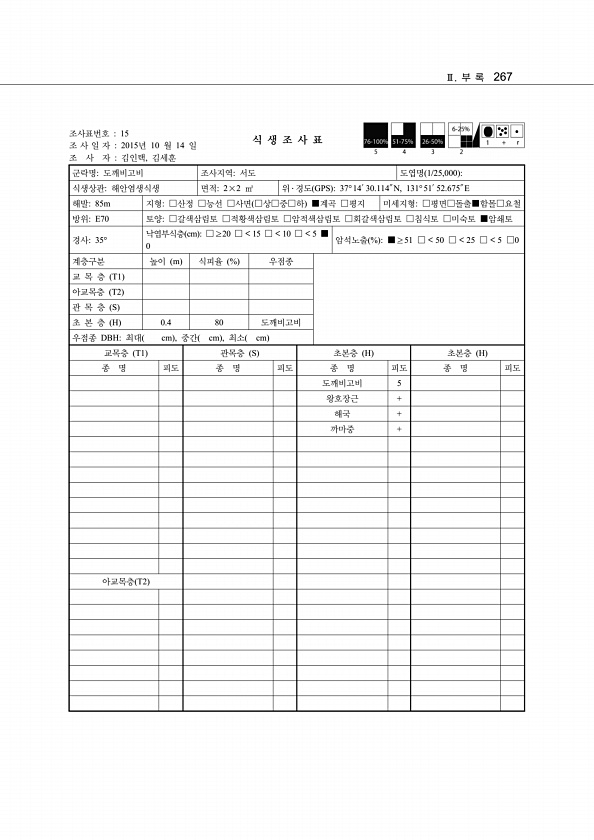 Ⅲ. 부 록 267 조사표번호 15 조 사 일 자 2015년 10 월 14 일 조 사 자 김인택, 김세훈 식 생 조 사 표 군락명도깨비고비 조사지역서도 도엽명 1/25,000 식생상관해안염생식생 면적2×2 ㎡ 위 ? 경도 GPS 37°14′ 30.114″N, 131°51′ 52.675″E 해발85m 지형□산정 □능선 □사면 □상□중□하 ■계곡 □평지 미세지형□평면□돌출■함몰□요철 방위E70 토양□갈색삼림토 □적황색삼림토 □암적색삼림토 □회갈색삼림토 □침식토 □미숙토 ■암쇄토 경사35° 낙엽부식층 cm □≥20 □ 15 □ 10 □ 5 ■ 0 암석노출 % ■≥51 □ 50 □ 25 □ 5 □0 계층구분 높이 m 식피율 % 우점종 교 목 층 T1 아교목층 T2 관 목 층 S 초 본 층 H 0.4 80 도깨비고비...