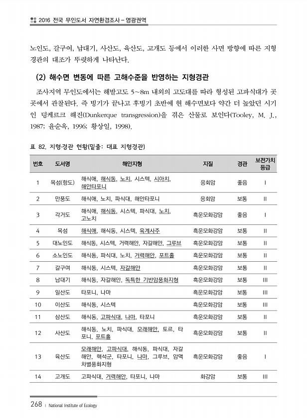 2016 전국 무인도서 자연환경조사 영광권역 268 ? National Institute of Ecology 노인도, 갈구여, 납대기, 사산도, 육산도, 고개도 등에서 이러한 사면 방향에 따른 지형 경관의 대조가 뚜렷하게 나타난다. 2 해수면 변동에 따른 고해수준을 반영하는 지형경관 조사지역 무인도에서는 해발고도 5∼8m 내외의 고도대를 따라 형성된 고파식대가 곳 곳에서 관찰된다. 즉 빙기가 끝나고 후빙기 초반에 현 해수면보다 약간 더 높았던 시기 인 덩케르크 해진 Dunkerque transgression 을 겪은 산물로 보인다 Tooley, M. J., 1987; 윤순옥, 1996; 황상일, 1998 번호 도서명 해안지형 지질 경관 보전가치 등급 1 목섬 항도 해식애, 해식동, 노치, 시스텍, 시아치, ...