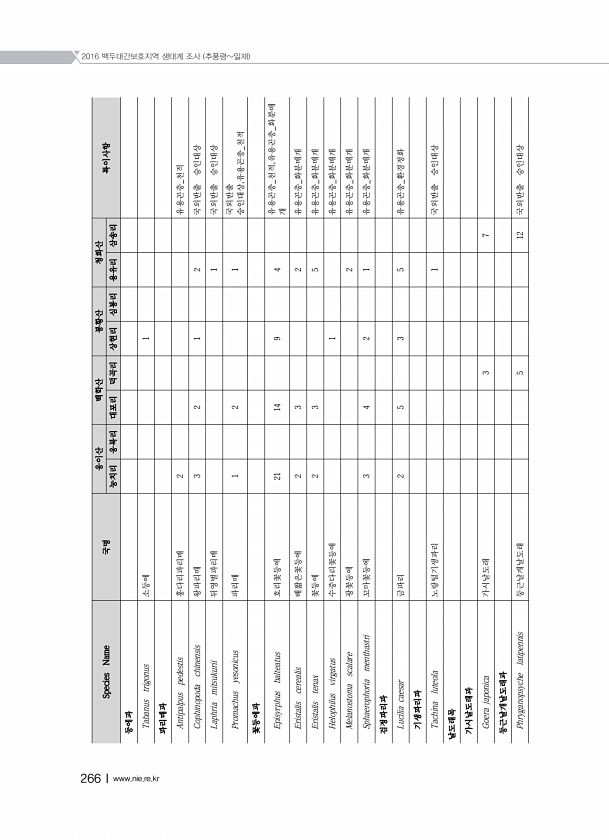 2016 백두대간보호지역 생태계 조사 추풍령밀재 266Ⅰwww.nie.re.kr Species Name 국명 웅이산 백학산 봉황산 청화산 특이사항 능치리 웅북리 대포리 덕곡리 상현리 심봉리 용유리 삼송리 등에과 Tabanus trigonus 소등에 1 파리매과 Antipalpus pedestis 홍다리파리매 2 유용곤충_천적 Cophinopoda chinensis 왕파리매 3 2 1 2 국외반출 승인대상 Laphria mitsukurii 뒤영벌파리매 1 국외반출 승인대상 Promachus yesonicus 파리매 1 2 1 국외반출 승인대상,유용곤충_천적 꽃등에과 Episyrphus balteatus 호리꽃등에 21 14 9 4 유용곤충_천적,유용곤충_화분매 개 Eristalis cerealis 배짧은꽃등에...