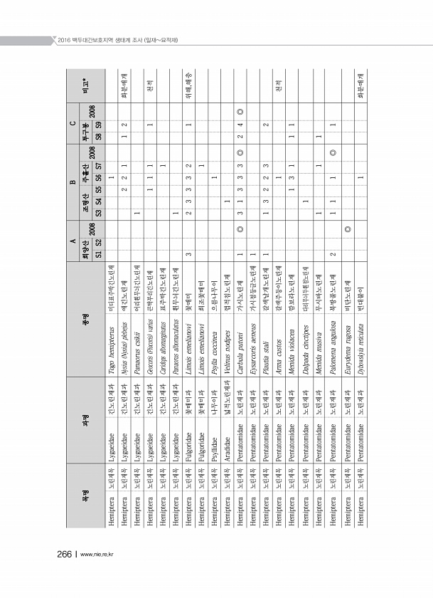 2016 백두대간보호지역 생태계 조사 밀재묘적재 266Ⅰwww.nie.re.kr 목명 과명 종명 A B C 희양산 비고* 2008 조령산 주흘산 2008 투구봉 2008 S1 S2 S3 S4 S5 S6 S7 S8 S9 Hemiptera 노린재목 Lygaeidae 긴노린재과 Togo hemipterus 미디표주박긴노린재 1 Hemiptera 노린재목 Lygaeidae 긴노린재과 Nysius Nysius plebejus 애긴노린재 2 2 1 1 2 화분매개 Hemiptera 노린재목 Lygaeidae 긴노린재과 Panaorus csikii 어리흰무늬긴노린재 1 Hemiptera 노린재목 Lygaeidae 긴노린재과 Geocoris Piocoris varius 큰딱부리긴노린재 1 1 1 1 천적 Hemiptera...