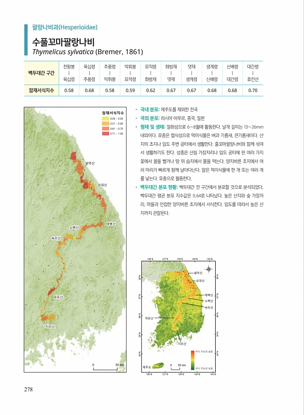 278 ? 국내 분포제주도를 제외한 전국 ? 국외 분포러시아 아무르, 중국, 일본 ? 형태 및 생태일화성으로 6∼8월에 활동한다. 날개 길이는 13∼26mm 내외이다. 유충은 협식성으로 먹이식물은 벼과 기름새, 큰기름새이다. 산 지의 초지나 임도 주변 공터에서 생활한다. 줄꼬마팔랑나비와 함께 섞여 서 생활하기도 한다. 성충은 산림 가장자리나 임도 공터에 핀 여러 가지 꽃에서 꿀을 빨거나 땅 위 습지에서 물을 먹는다. 양지바른 초지에서 여 러 마리가 빠르게 함께 날아다닌다. 알은 먹이식물에 한 개 또는 여러 개 를 낳는다. 유충으로 월동한다. ? 백두대간 분포 현황백두대간 전 구간에서 분포할 것으로 분석되었다. 백두대간 평균 분포 지수값은 0.64로 나타났다. 높은 산지와 숲 가장자 리, 마을과 인접한 양지바...
