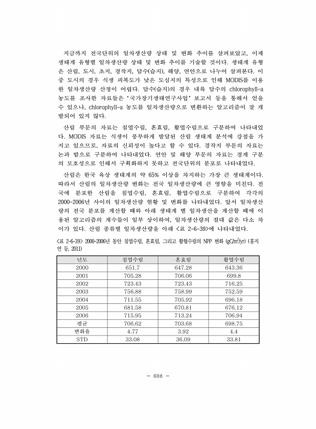 608 지금까지 전국단위의 일차생산량 상태 및 변화 추이를 살펴보았고, 이제 생태계 유형별 일차생산량 상태 및 변화 추이를 기술할 것이다. 생태계 유형 은 산림, 도시, 초지, 경작지, 담수 습지 , 해양, 연안으로 나누어 살펴본다. 이 중 도시의 경우 식생 피복도가 낮은 도심지의 특성으로 인해 MODIS를 이용 한 일차생산량 산정이 어렵다. 담수 습지 의 경우 내륙 담수의 chlorophyll-a 농도를 조사한 자료들은‘국가장기생태연구사업’보고서 등을 통해서 얻을 수 있으나, chlorophyll-a 농도를 일차생산량으로 변환하는 알고리즘이 잘 개 발되어 있지 않다. 산림 부문의 자료는 침엽수림, 혼효림, 활엽수림으로 구분하여 나타내었 다. MODIS 자료는 식생이 풍부하게 발달된 산림 생태계 분석에 강점...