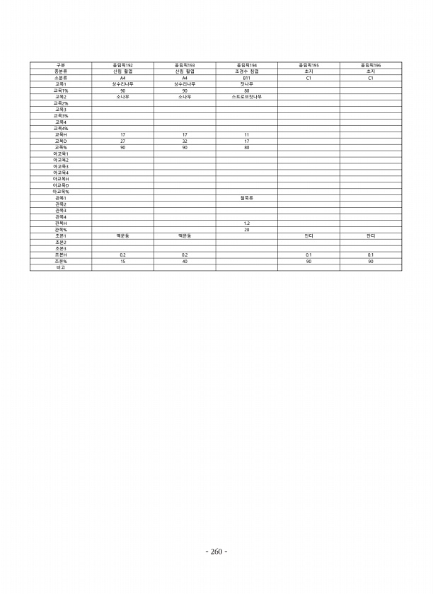 구분 올림픽192 올림픽193 올림픽194 올림픽195 올림픽196 중분류 산림 활엽 산림 활엽 조경수 침엽 초지 초지 소분류 A4 A4 B11 C1 C1 교목1 상수리나무 상수리나무 잣나무 교목1% 90 90 80 교목2 소나무 소나무 스트로브잣나무 교목2% 교목3 교목3% 교목4 교목4% 교목H 17 17 11 교목D 27 32 17 교목% 90 90 80 아교목1 아교목2 아교목3 아교목4 아교목H 아교목D 아교목% 관목1 철쭉류 관목2 관목3 관목4 관목H 1.2 관목% 20 초본1 맥문동 맥문동 잔디 잔디 초본2 초본3 초본H 0.2 0.2 0.1 0.1 초본% 15 40 90 90 비고 260