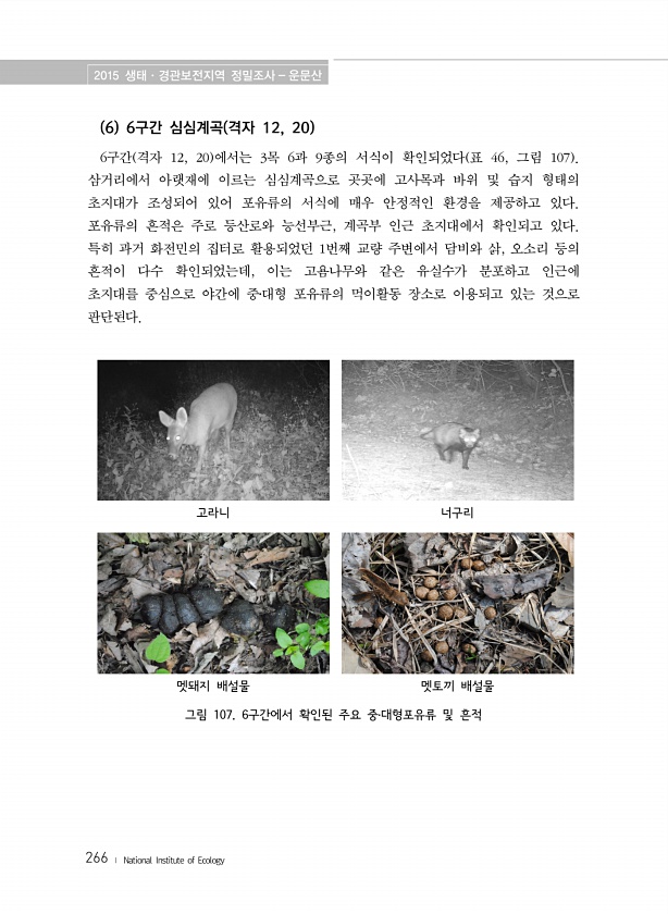 2015 생태·경관보전지역 정밀조사 운문산 266 ? National Institute of Ecology 6 6구간 심심계곡 격자 12, 20 6구간 격자 12, 20 에서는 3목 6과 9종의 서식이 확인되었다 표 46, 그림 107 삼거리에서 아랫재에 이르는 심심계곡으로 곳곳에 고사목과 바위 및 습지 형태의 초지대가 조성되어 있어 포유류의 서식에 매우 안정적인 환경을 제공하고 있다. 포유류의 흔적은 주로 등산로와 능선부근, 계곡부 인근 초지대에서 확인되고 있다. 특히 과거 화전민의 집터로 활용되었던 1번째 교량 주변에서 담비와 삵, 오소리 등의 흔적이 다수 확인되었는데, 이는 고욤나무와 같은 유실수가 분포하고 인근에 초지대를 중심으로 야간에 중?대형 포유류의 먹이활동 장소로 이용되고 있는 것으로 판단된다...