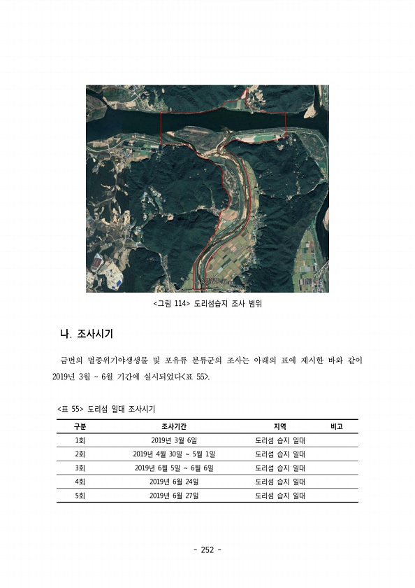 252 그림 114 도리섬습지 조사 범위 금번의 멸종위기야생생물 및 포유류 분류군의 조사는 아래의 표에 제시한 바와 같이 2019 3 6 년 월 월 기간에 실시되었다 표 55 구분 조사기간 지역 비고 회1 2019 3 6 년 월 일 도리섬 습지 일대 회2 2019 4 30 5 1 년 월 일 월 일 도리섬 습지 일대 회3 2019 6 5 6 6 년 월 일 월 일 도리섬 습지 일대 회4 2019 6 24 년 월 일 도리섬 습지 일대 회5 2019 6 27 년 월 일 도리섬 습지 일대 표 55 도리섬 일대조사시기
