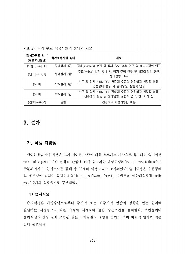 266 식생자연도 점수 [식생보전등급] 국가식생자원 정의 개요 10 [Ⅰ]~ 9 [Ⅰ] 절대감시 1급 절대 absolute 보전 및 감시, 장기 추적 연구 및 비파괴적인 연구 8 [Ⅱ]~ 7 [Ⅱ] 절대감시 2급 주요 critical 보전 및 감시, 장기 추적 연구 및 비파괴적인 연구, 생태탐방 교육 6 [Ⅲ] 주요감시 1급 보존 및 감시 UNESCO-완충대 수준의 건전하고 선택적 이용, 전통생태 활동 및 생태탐방, 실험적 연구 5 [Ⅲ] 주요감시 2급 보존 및 감시 UNESCO-전이대 수준의 건전하고 선택적 이용, 전통생태 활동 및 생태탐방, 실험적 연구, 연구기지 등 4 [Ⅲ]~ 0 [Ⅴ] 일반 건전하고 지탱가능한 이용 표 3 국가 주요 식생자원의 정의와 개요 3. 결과 가. 식생 다양성 담양하천습지내 ...